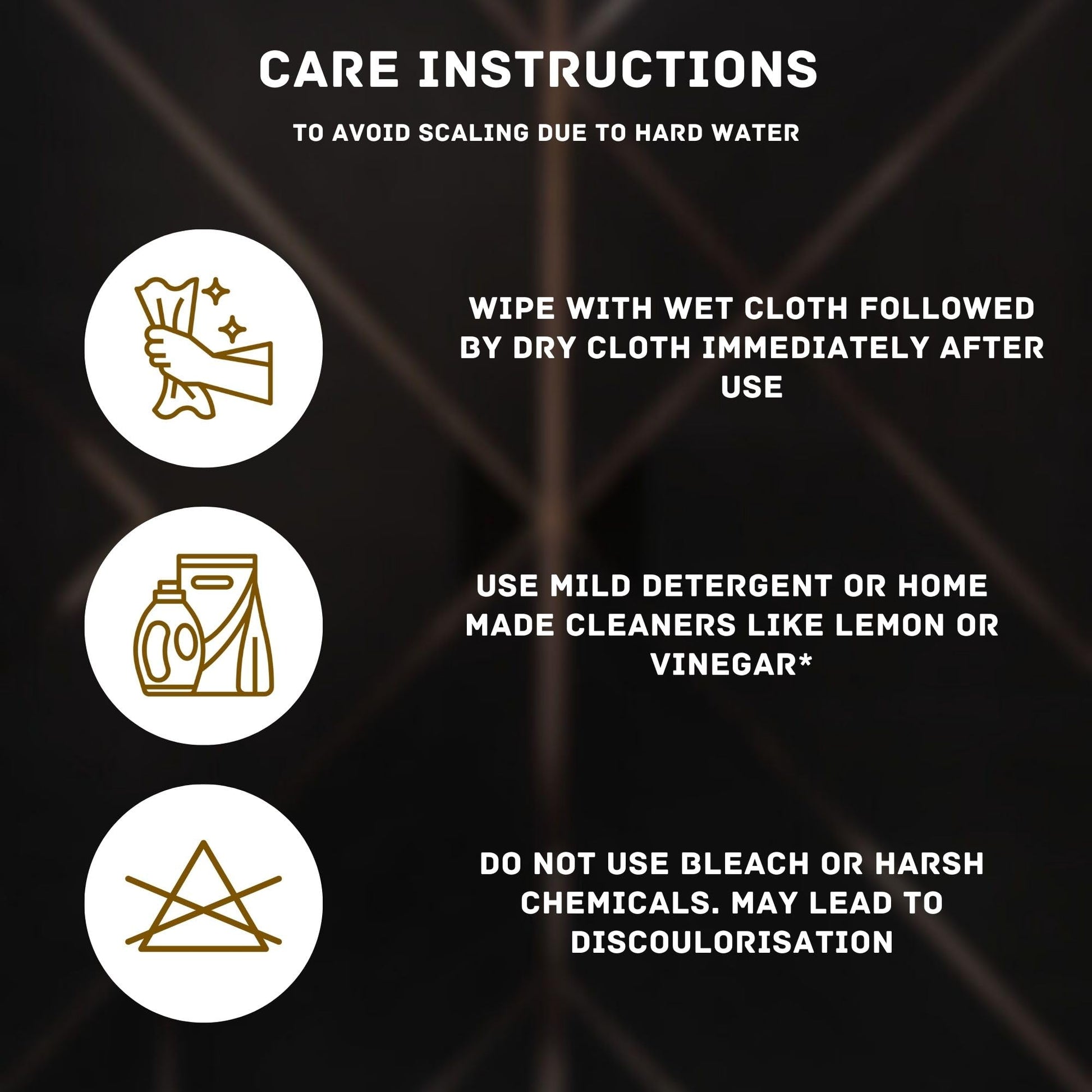 CARE INSTRUCTIONS: Clean regularly with non-abrasive cleaners, avoid harsh chemicals like Acid or cleaners to avoid scaling and discoloration. Wipe with Dry cloth where necessary.